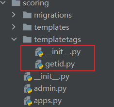 在 scoring 目录中新建立一个 templatetags 文件夹,其中创建两个文件 __init__.py 与 getid.py,目录结构如下: