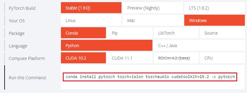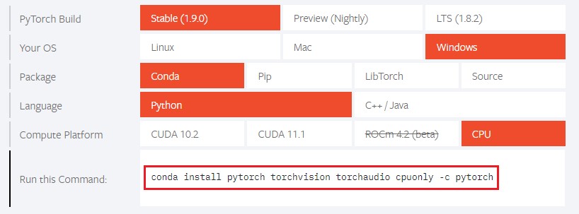 Compute Platform选择cpu,并复制指令到Anaconda Powershell Prompt中运行