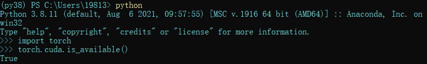 Anaconda Powershell Prompt中输入python,并输入以下代码import torch torch.cuda.is_available() -