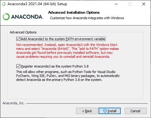 Anaconda自动添加环境变量,建议勾选,之后不用手动添加环境变量 - 第二个:将