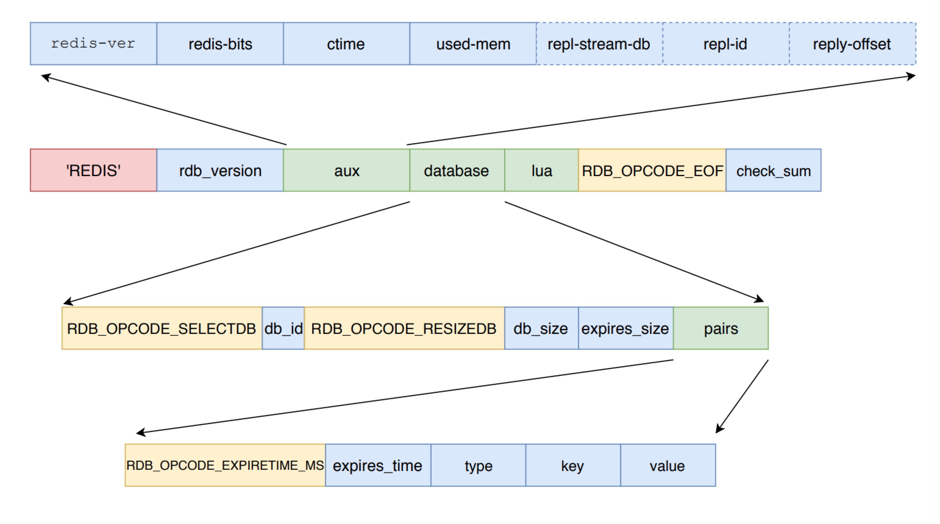 rdbSaveRio在写键值时,会调用rdbSaveKeyValuePair 函数。该函数会依次写入键值的过期时间,键的类型,键和值。