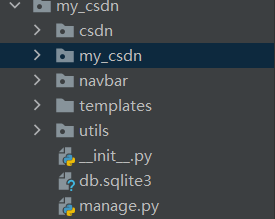 在项目根目录(本项目根目录为 my_csdn,该目录下存在一个同名的 my_csdn 文件)创建一个 navbar 应用,同步需要注册在 settings.py 中。