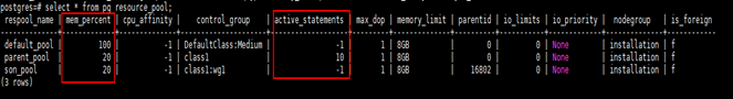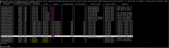 select threadid,processid,usename,attribute,status,enqueue,statement_mem,active_points,control_group,resource_pool,substring(query,position('explain' in query),20) as subquery from pg_session_wlmstat order by status,attribute,usename,subquery,resource_pool;