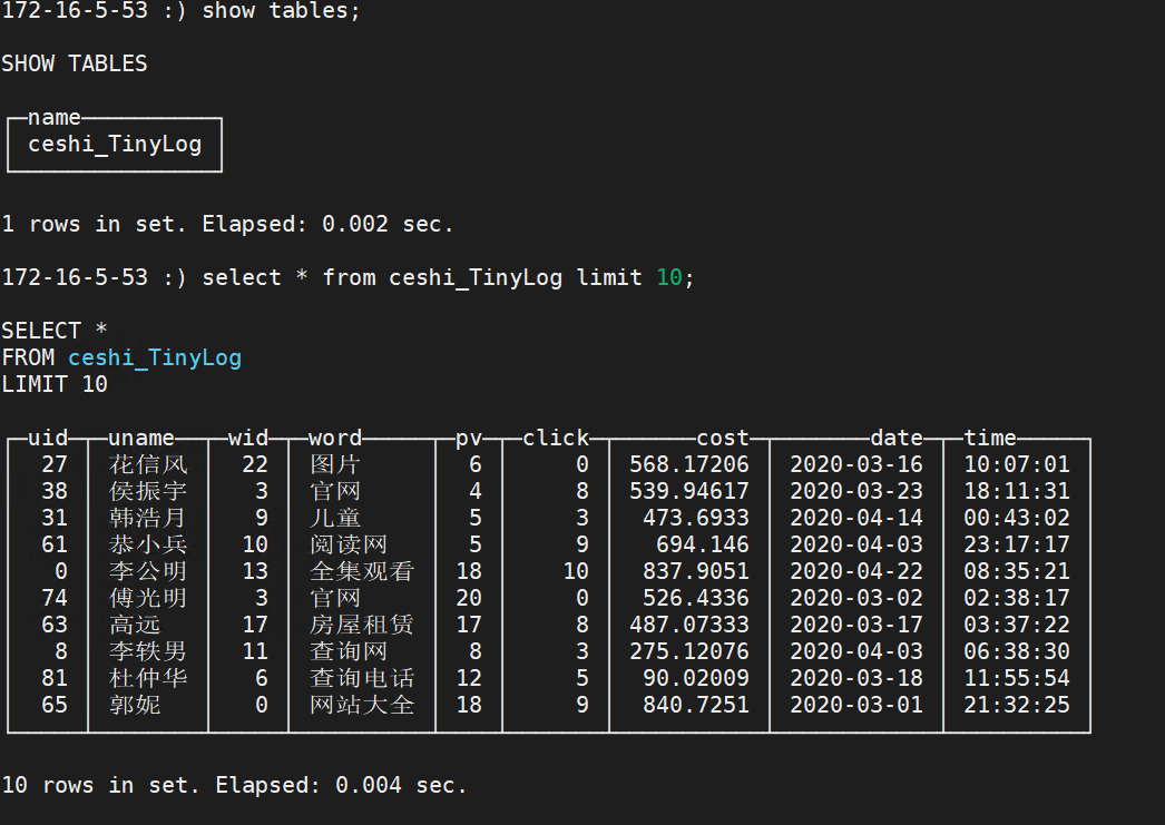 clickhouse client -m --host 172.16.5.53 --port 21423 --database="default" --query="insert into default.ceshi_TinyLog FORMAT CSV" < /opt/clickhousenew.csv clickhouse client -m --host 172.16.5.52 --port 21423 --database="default" --query="insert into default.ceshi_TinyLog FORMAT CSV" < /opt/clickhousenew.csv样例数据clickhousenew.csv