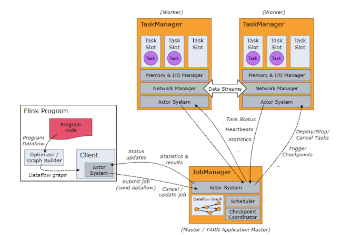 JobManager(下称为JM)负责整个Flink集群任务的调度以及资源的管理,从客户端中获取提交的应用,然后根据集群中的taskmanager的slot的使用情况,为提交的应用分配响应slot资源。JM是整个集群的master节点,其可以理解为一个MR任务的ApplicationMaster,负责整个集群的资源管理和任务调度。JM和taskmanager之间通信通过actor system进行通信(akka框架),JM定期能够获取任务的运行情况发给客户端。同时JM也会触发checkpoint的操作,JM会根据checkpoint的定时时间,向taskmanager下发checkpoint的指令。