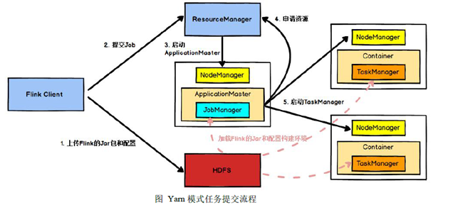 Flink 任务提交后, Client 向HDFS 上传Flink 的Jar 包和配置, 之后向Yarn ResourceManager 提交任务, ResourceManager 分配Container 资源并通知对应的NodeManager 启动ApplicationMaster,ApplicationMaster 启动后加载Flink 的Jar 包和配置构建环境,然后启动JobManager,之后ApplicationMaster 向ResourceManager申请资源启动TaskManager , ResourceManager 分配Container 资源后, 由ApplicationMaster 通知资源所在节点的NodeManager 启动TaskManager ,NodeManager 加载Flink 的Jar 包和配置构建环境并启动TaskManager,TaskManager启动后向JobManager 发送心跳包,并等待JobManager 向其分配任务。