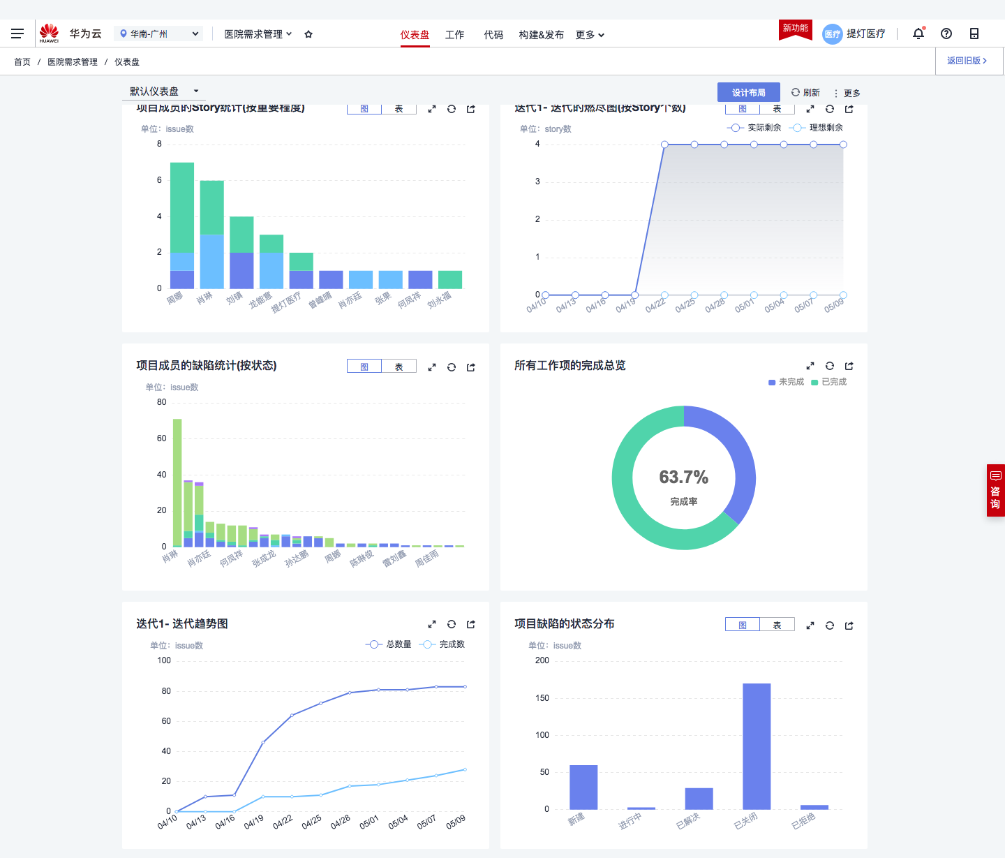 提灯医疗使用华为云 DevCloud ,能够全量管理产品研发、运维和实施体系,全面覆盖医疗业务场景,高质量满足医院客户的个性化需求,推动提灯持续地提供契合临床需要的创新应用,使用成效呈现如下: