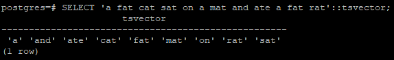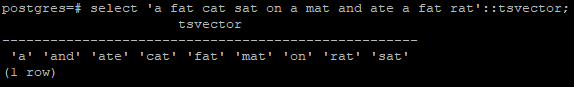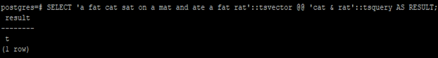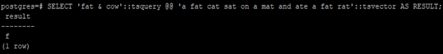 SELECT 'fat & cow'::tsquery @@ 'a fat cat sat on a mat and ate a fat rat'::tsvector AS RESULT; 查询结果: