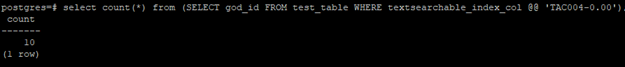 select count(*) from (SELECT god_id FROM test_table WHERE textsearchable_index_col @@ 'TAC004-0.00') 查询结果: