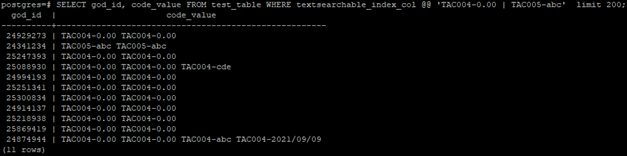 SELECT god_id, code_value FROM test_table WHERE textsearchable_index_col @@ 'TAC004-0.00 | TAC005-abc' limit 200; 查询结果: