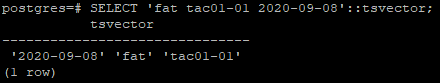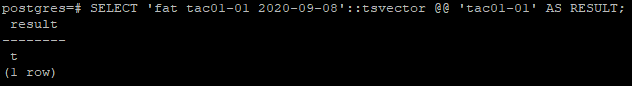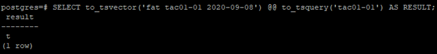 | SELECT to_tsvector('fat tac01-01 2020-09-08') @@ to_tsquery('tac01-01') AS RESULT; 查询结果:
