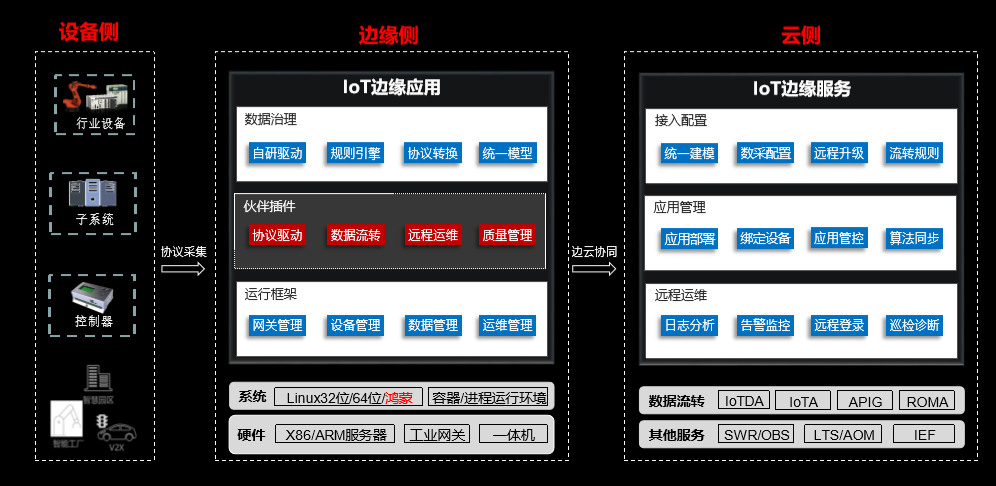IoT边缘云服务的形态,分为云侧和边缘侧,边侧主要分为华为云IoT边缘提供了数据治理,伙伴插件和运行框架,运行框架相当于章鱼触手的躯干,用于屏蔽底层系统和硬件带来的差异,同时保证上层业务的正常运行,伙伴插件相当于触手上的吸盘,是边缘数据的入口,也是边缘的抓手,数据处理相当于触手里的小脑,对数据进行处理与流转。