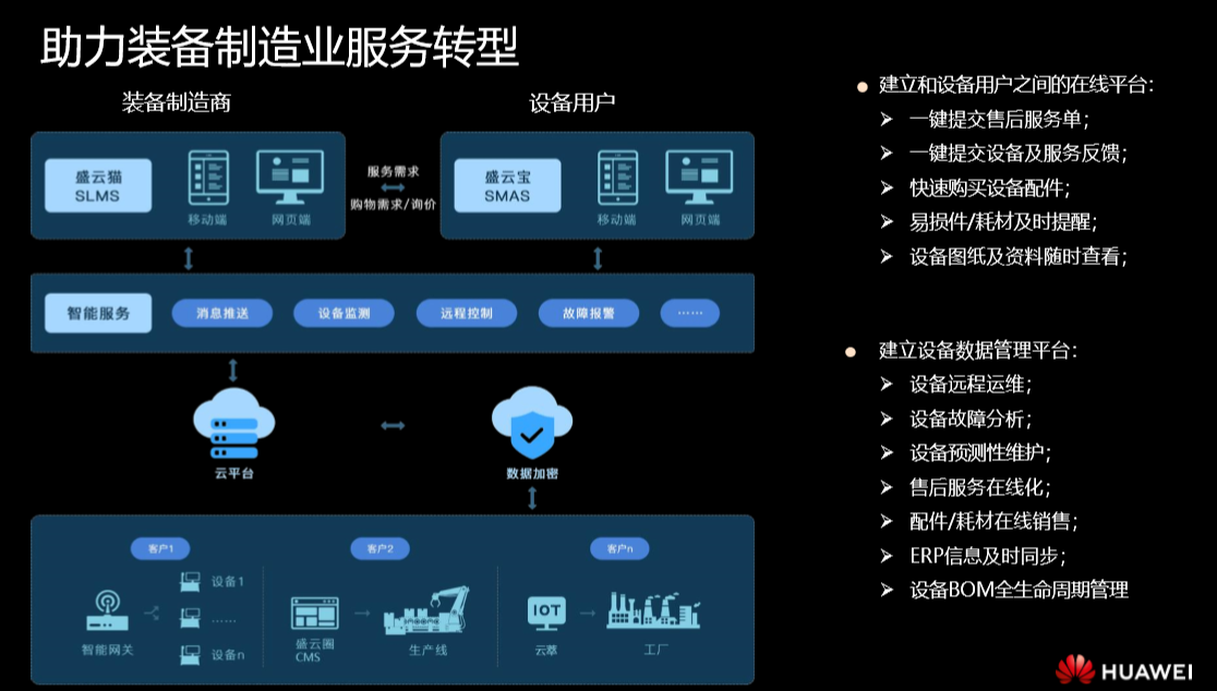 盛原成是一家专注于装备行业,致力于装备行业数字化,智能化,服务化转型公司,对行业有深刻的认识,研发力量强大,研发人员比例占到80%,专注装备行业获得认可,拿到A和A+轮的投资。盛原成和华为在2016年就开始合作了,主要产品有盛云圈CMS和盛云猫SLM。这两款是盛原成主营装备行业的拳头产品,和IoT边缘集成的是盛云圈,也是我们本次合作的重点。云端盛云猫在2018年就集成了IoTDA,上了华为云的严选,这次主要打造CMS和轻边缘的集成,两个产品通过华为云IoT服务结合在一起能对设备的全生命周期进行管理。