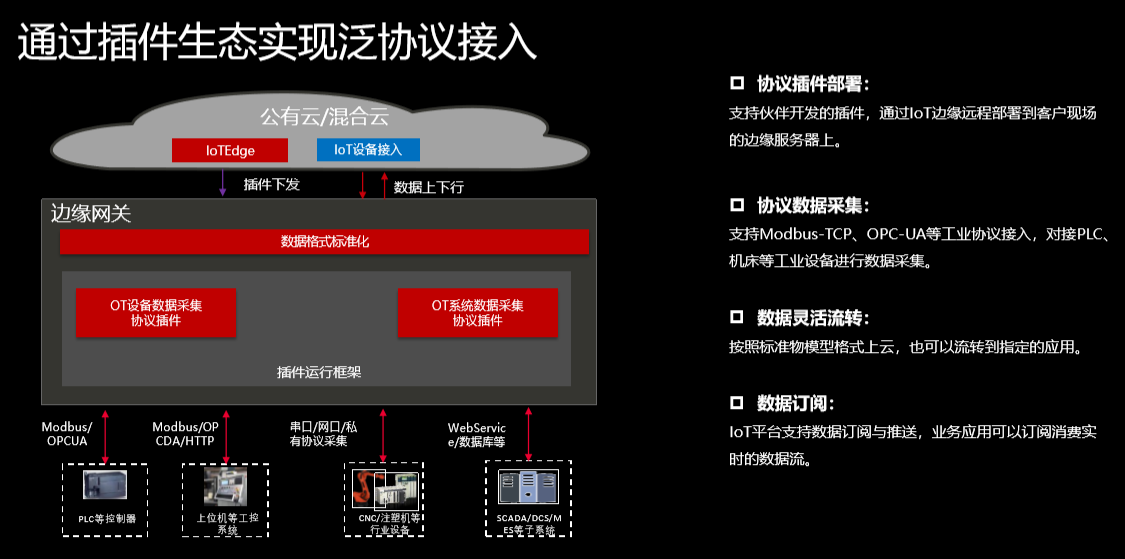 边缘可以提供插件运行框架,借助生态的力量,让懂行业knowhow的人,跟华为云IoT一起解决这些痛点。IoT加上生态伙伴后,就可以在客户现场提供数据采集能力,把工业设备按协议采集,进一步将数据路由到指定应用,最终由应用业务闭环,这时,我们就构建了插件生态,做到了真正的万物互联。