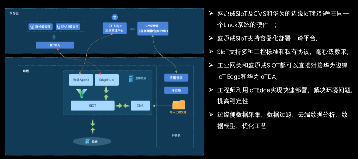 上图是盛原成插件在边缘侧与华为云IoT集成部署的数据流以及SIoT和IoT边缘集成后的架构。现场也就是边缘侧是边缘站点和现场设备,云端的是华为云IoT的中间件及上层的SAAS应用,实施人员只需要在本地的环境,用CMS的开发版本,配置好采集的点表和需要展示的标准模块,通过远程工具将工程文件导入到纳管的IoT边缘节点,在IoT边缘平台将CMS的镜像拉取部署到节点上,这样简单的3个步骤就能快速完成部署,打通整个底层设备到云端的数据链路。