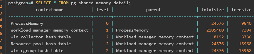 查询pgxc_total_memory_detail视图查看整个集群的状态,必须具有sysadmin权限。1postgres=# SELECT * FROM pgxc_total_memory_detail;用户可以通过视图pg_shared_memory_detail查询共享内存上下文信息: