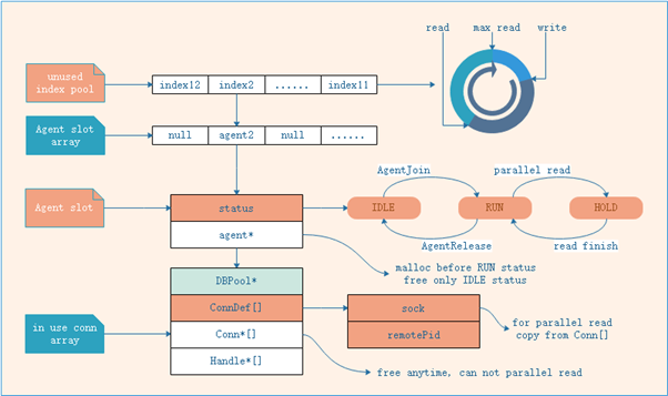 - Conn*指针会随时free,无法实现无锁并行读。agent中Conn*连接指针中保存的socket和remotePid信息,复制一份存入ConnDef。ConnDef与agent整体一起malloc/free,在RUN状态时,此部分内存是实时可读的。