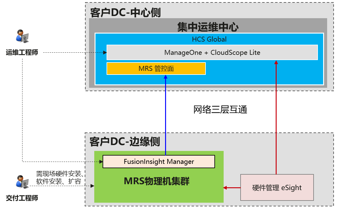 在HCS的行业云上 ,需要能够支持将已经在线下销售给客户的存量 F I集群 (集群部署在客户I DC机房的物理机 )纳管到行业云上的M RS管控面 统一运维管理。