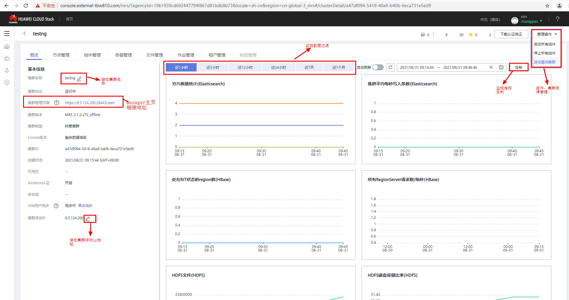 在集群概览页面可进行集群名称修改 、 manager系统跳转登录 、监控指标定制管理、监控数据过滤显示、修改集群浮动I P 、 集群组件启停管理 、集群任务查询 等操作 , 具体操作如下图所示 :