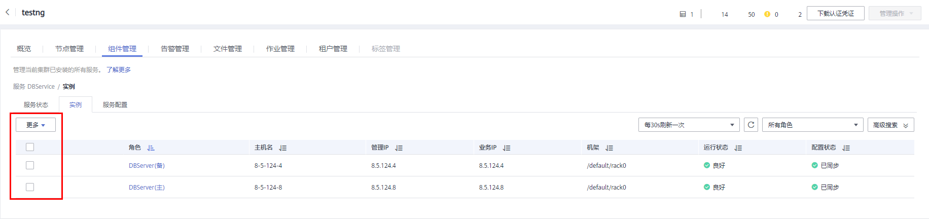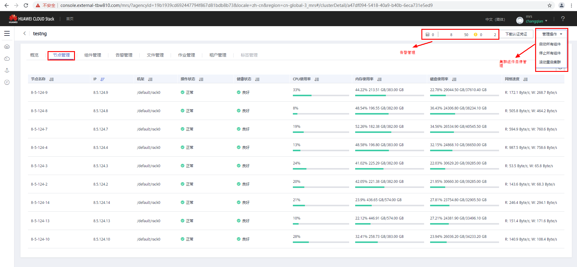在节点管理页可对集群中的节点信息进行列表显示 , 并且支持根据不同属性排序功能 , 右上角集群组件管理 、 告警管理功能在所有 标签页均支持此功能