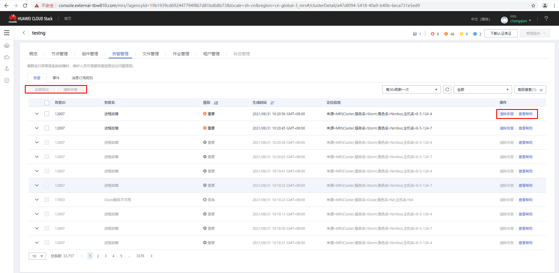 在告警管理页签支持告警 / 事件信息分页列表显示 、 告警 / 事件 信息查询排序 、告警 / 事件 信息导出、告警清除等功能