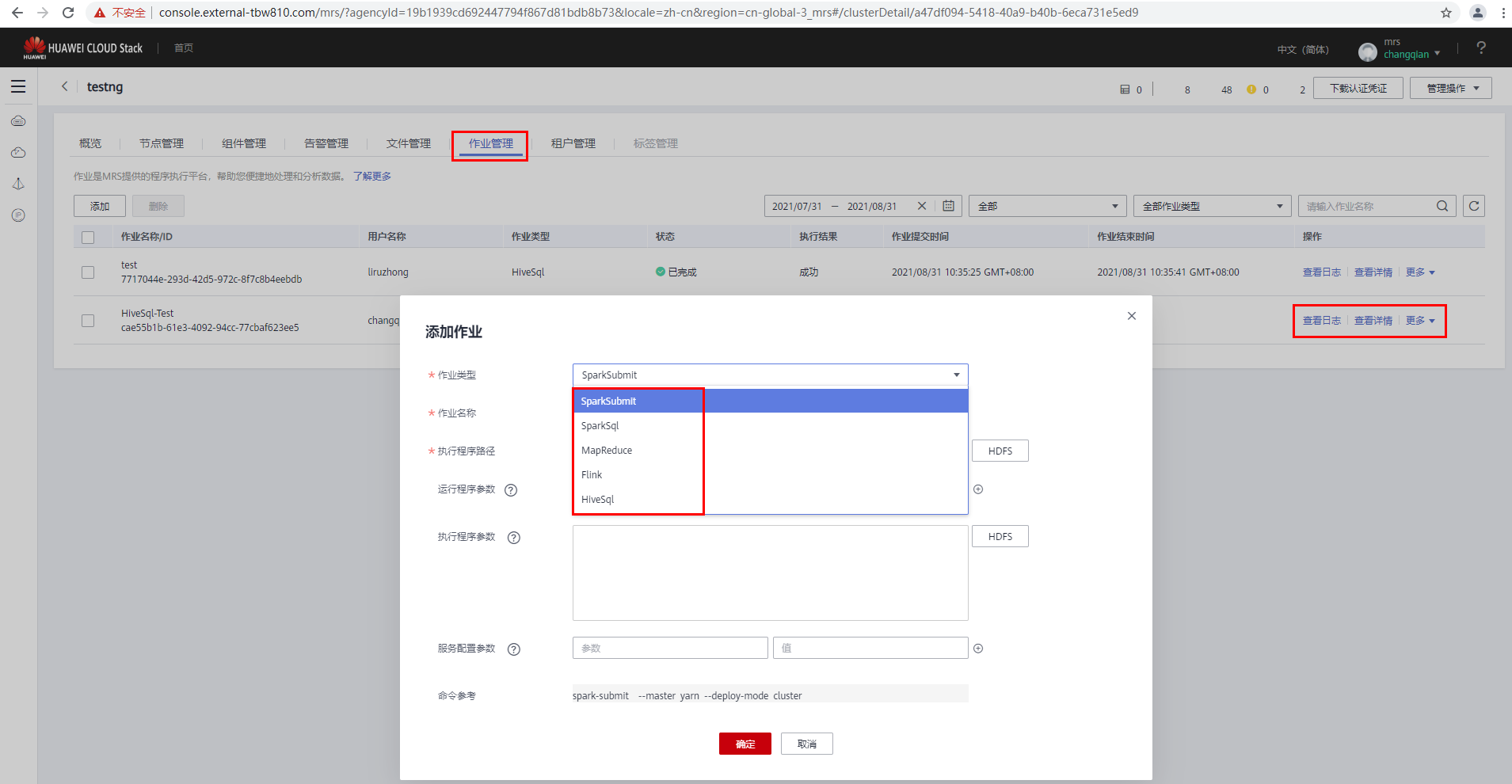 作业管理标签页支持 添加、查看、删除作业功能,可创建 Spark、MapReduce、Flink、Hive类作业,支持作业信息分页展示