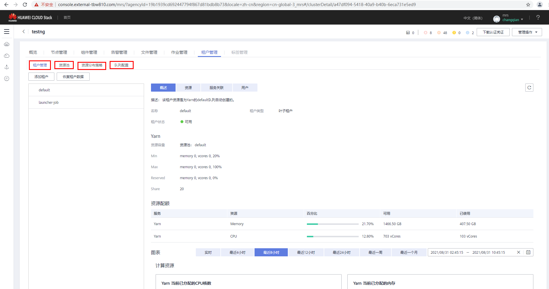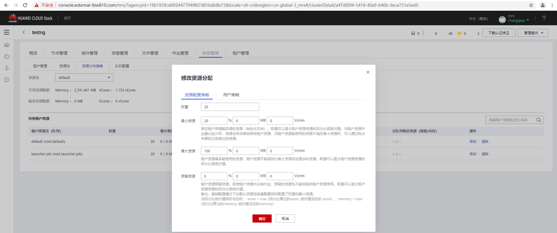 租户管理页签主要包含租户信息管理、资源池管理、资源分布策略设置、队列配置,如下图所示