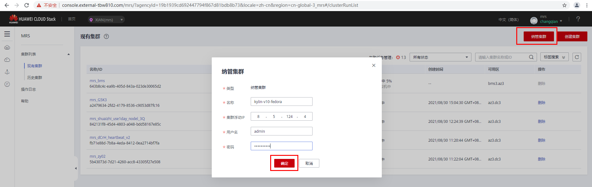4 .3 、 在MRS控制台上选择 “纳管集群” ,在弹出的对话框中分别填入以下参数。填写完毕后,单击“确定” 进行纳管操作 。