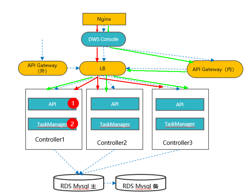 当Console-Stage流量过来经过,优先从ServiceCM中去取流控配置,ServiceCM中未配置,则从本机读。之前方案是直接DWSConsole接收到流量时,通过ConsoleStage做了一次接口透传将DWSConsole的流量通过LB转发到DWSConstroller,DWSConstroller只做了简单的流量控制。当有大流量冲击的时候,会对DWSController造成巨大冲击,严重时可能造成服务瘫痪,流量转发如下图中的红线。DWS服务过载方案是,当DWSConsole接收到流量请求时候,不会直接通Console-Stage将流量直接转发到LVS。而是通过Console-Stage将流量转发到API网关(API网关也集成OLC),API网关可以对Console下发的每一个接口进行流量控制,设置接口阈值,最后由API网关将流量转发到LB,LB将流量转发到DWSController。如图下入中红线所示。