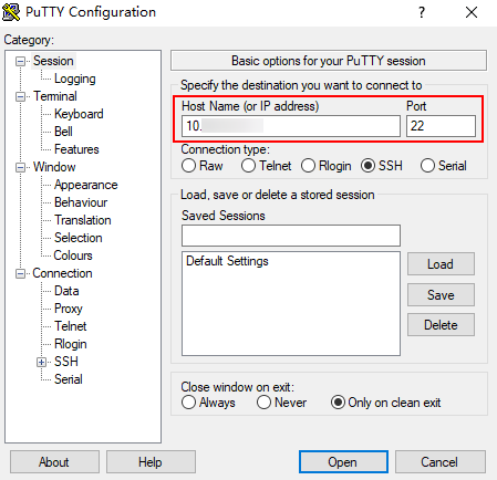 1. 运行PuTTY,单击“Session”,在“Host Name(or IP address)”的输入框中输入服务器IP,在“Port”输入框中输入端口号,如图2-1所示。