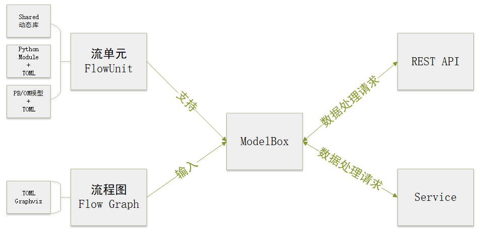 在应用构建完成后,结合ModelBox的框架才能形成完整可运行的应用。ModelBox作为应用入口,首先进行流单元的扫描加载、应用流程图读取构建,然后接收数据处理请求,数据触发ModelBox中的执行引擎对流单元进行调度,最终完成请求的数据处理任务。