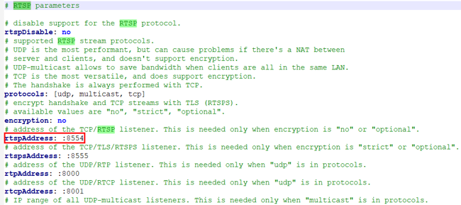打开rtsp-simple-server.yml可修改RTSP服务相关的配置参数,如端口号默认为8554,可以根据需要修改。
