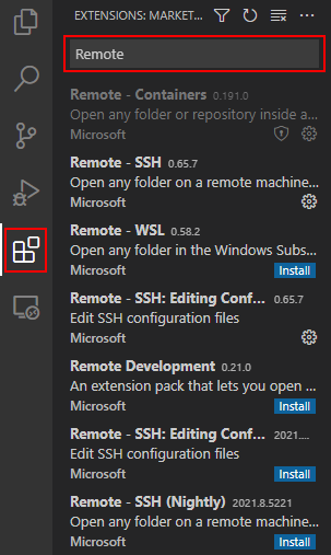,搜索并安装Remote-SSH、Remote-Containers、Docker等插件。