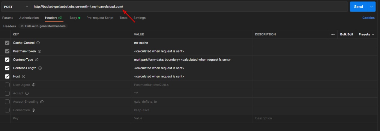 5、打开postman软件,选择POST方法。 (1)地址栏填入http:// 访问域名 / 。我写的是http://bucket-guxiaobei.obs.cn-north-4.myhuaweicloud.com/ (2)其他Headers参考下图。 注意:postman有一些自动生成的头信息auto-generated headers,并不都是必须项。