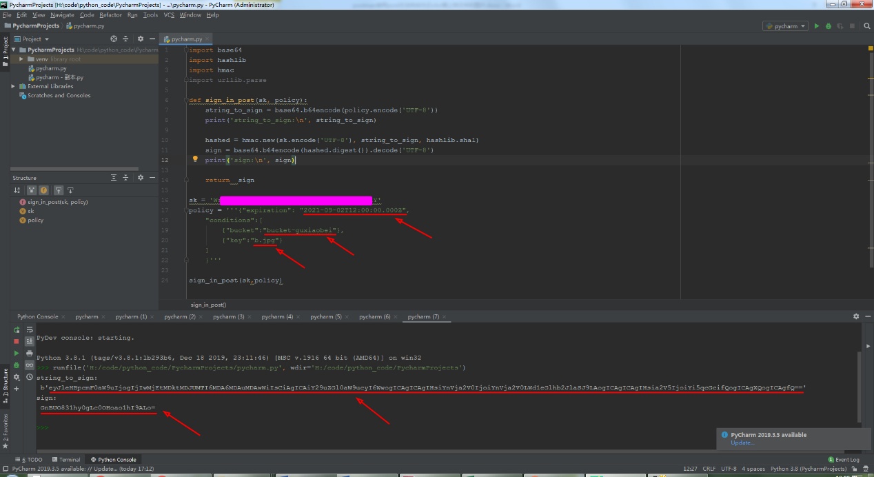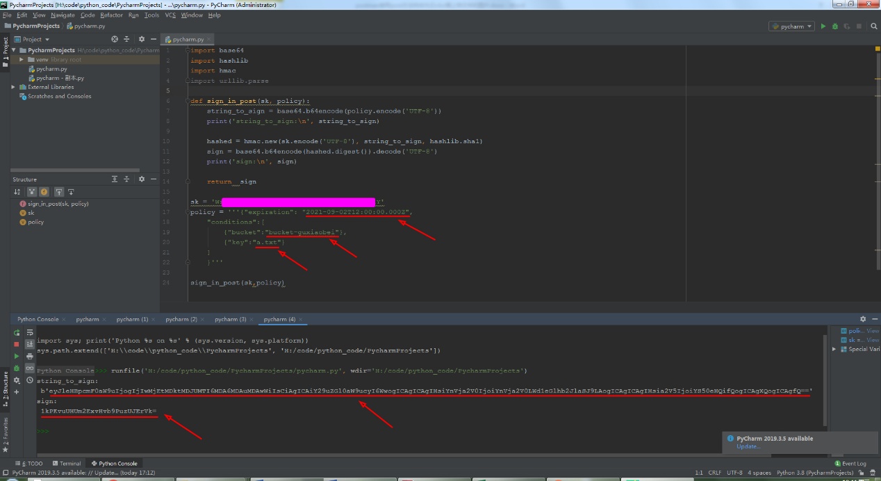 4、在pycharm里运行,可以得到policy和signature。 (1)sk为你实际Secret Access Key内容。 (2)expiration为过期时间。 (3)bucket为你的桶名。 (4)key为期望上传对象的名字。