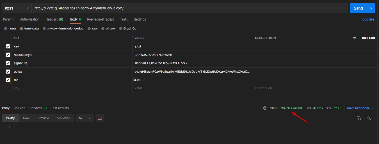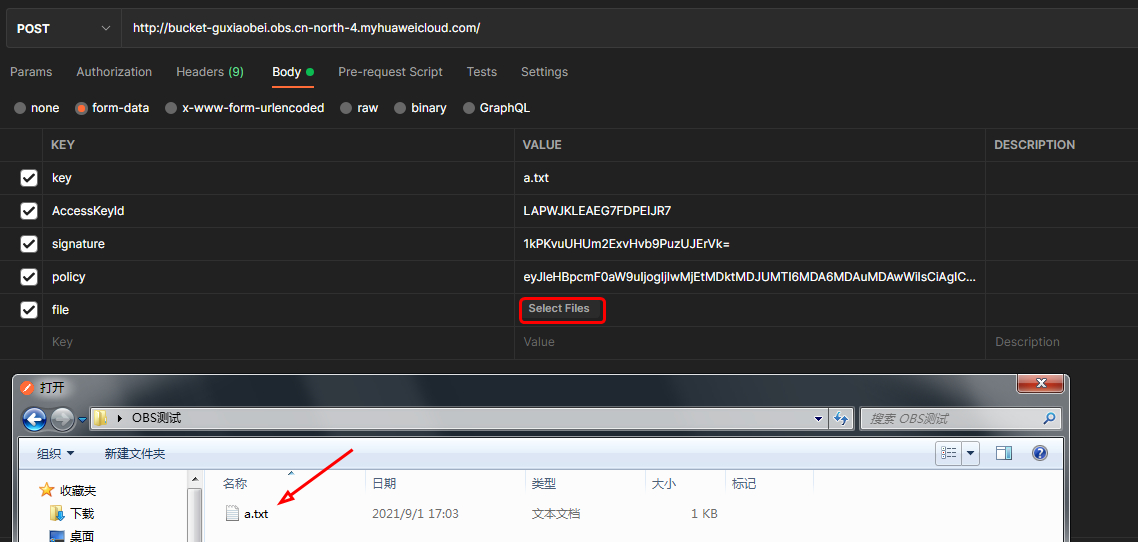 1、准备一个a.txt文档。内容随意。  2、OBS服务支持基于浏览器的POST上传对象请求,此类请求的签名信息通过表单的方式上传。 请参考网址 https://support.huaweicloud.cn/api-obs/obs_04_0012.html