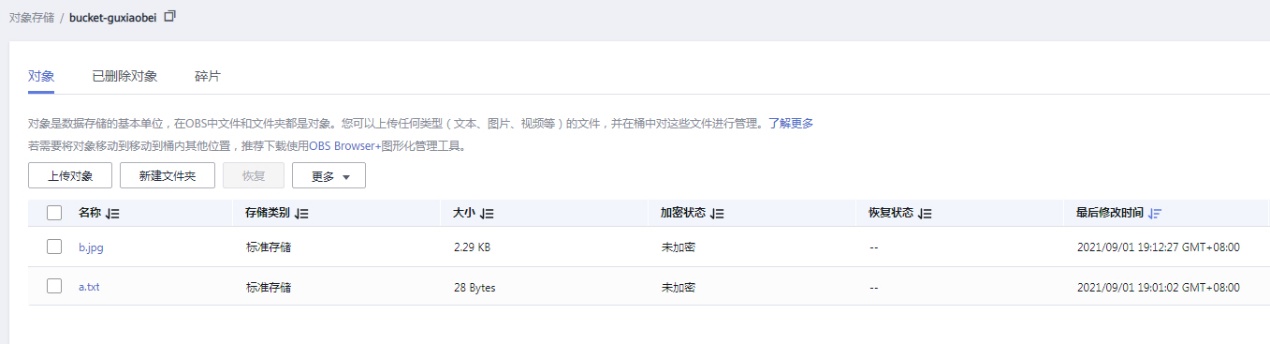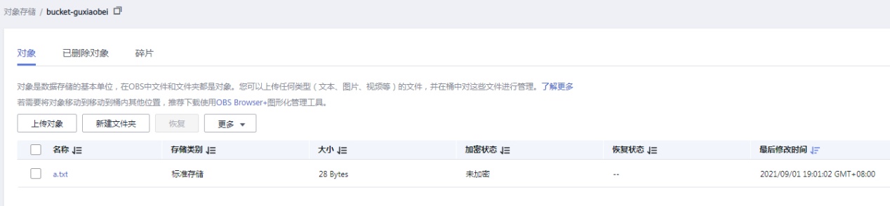 8、返回华为云OBS控制台。可以看到a.txt已经上传。点击下载。  8、完成txt上传。 注意:OBS并不强制本地文件名和OBS桶的期待文件名,保持一致。你可以本地a.txt,上传为b.txt。