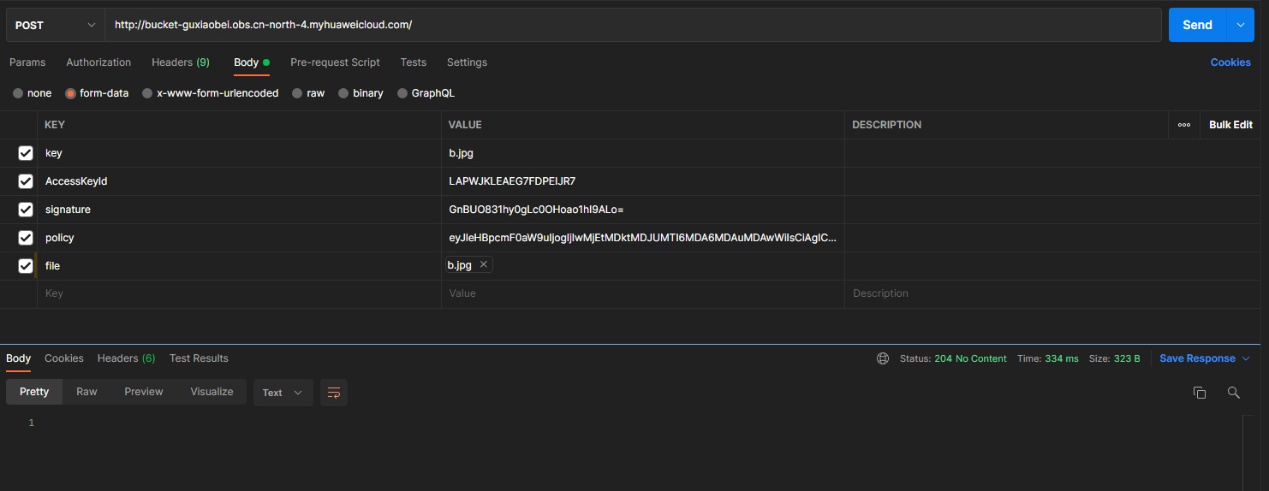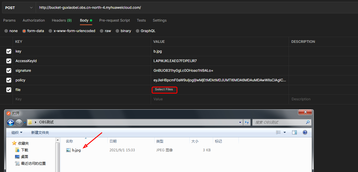 1、准备一个b.jpg图片。内容随意。  2、OBS服务支持基于浏览器的POST上传对象请求,此类请求的签名信息通过表单的方式上传。 请参考网址 https://support.huaweicloud.cn/api-obs/obs_04_0012.html