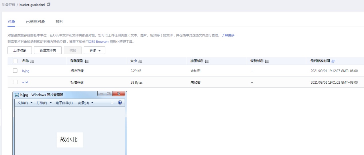 8、返回华为云OBS控制台。可以看到b.jpg已经上传。点击下载。  8、完成jpg上传。 注意:OBS并不强制本地文件名和OBS桶的期待文件名,保持一致。你可以本地a.jpg,上传为b.jpg。