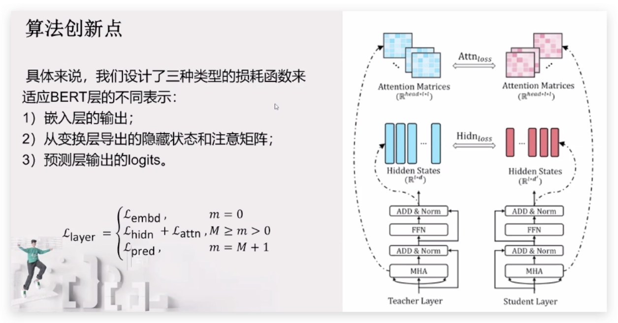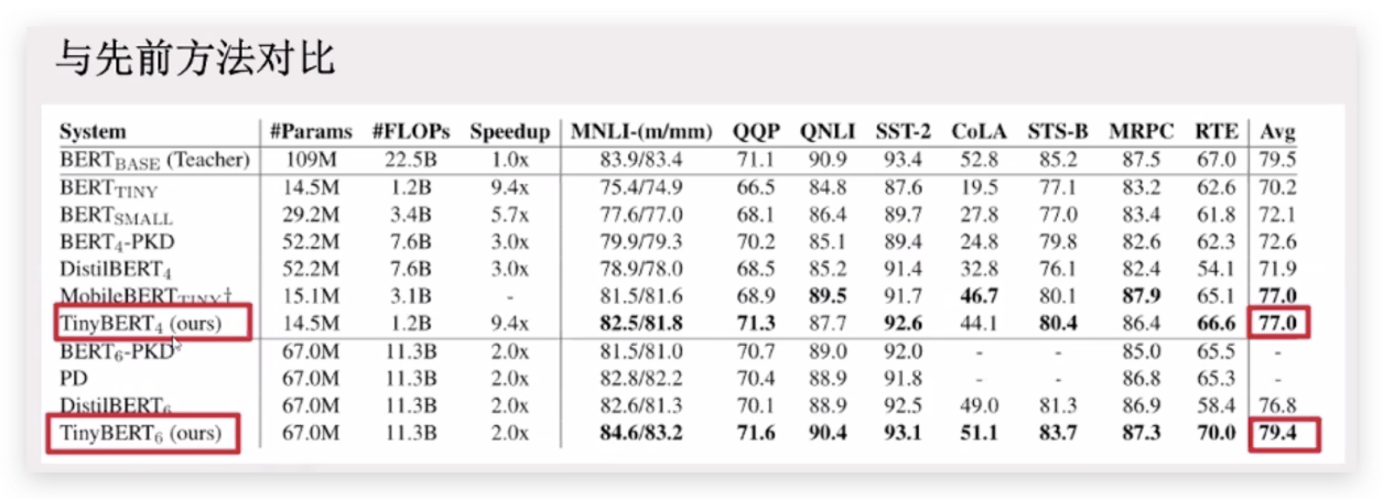 • 提出了- -种新的Transformer蒸馏方法,能更好的将教师BERT base所编码的语言知识充分地转移到TinyBERT;