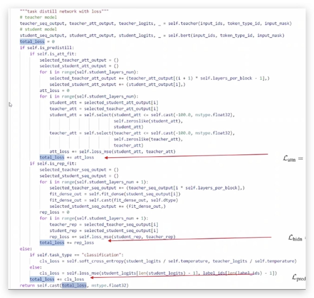 蒸笼算法与三个核心loss组成,分别是attn/hidn/pred组成,通过反响更新参数来进行实现。