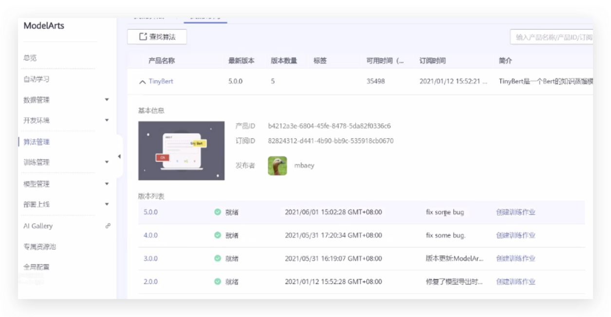 从AI Gallery搜索TinyBert蒸馏模型,对该模型进行订阅,