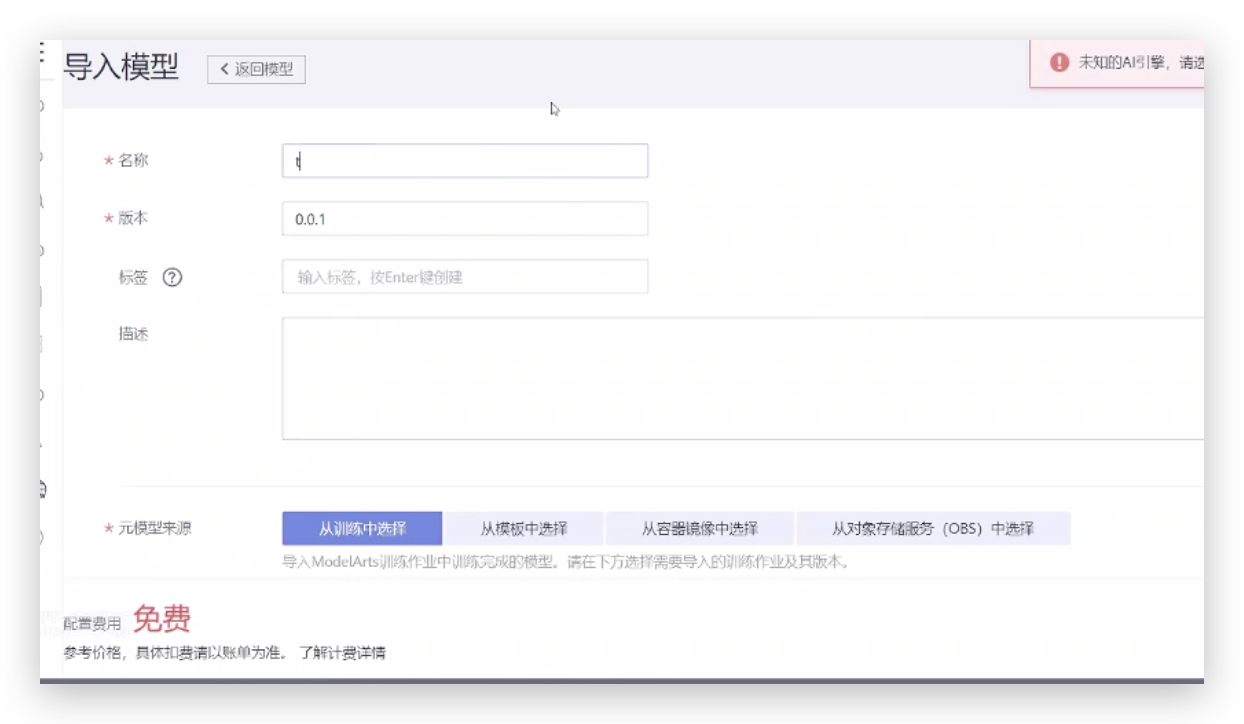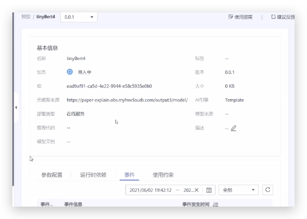 • 将模型进行在线部署,首先导入模型,从模版导入模型