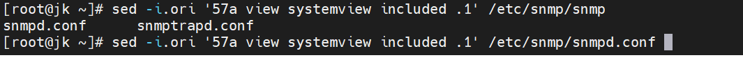 sed -i.ori '57a view systemview included .1' /etc/snmp/snmpd.conf