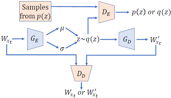 GAN结构2:GAN结构2中,生成器对应的是变分自编码器中的解码器部分 ,判别器对应的是 ,此GAN结构的目的是进一步约束自编码器的输出以让自编码器更好的学习时序数据的正常分布。和上面相似,生成器和判别器的损失函数为