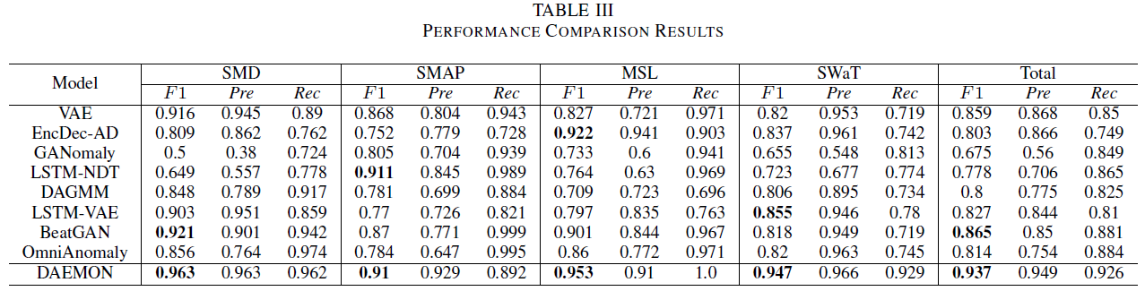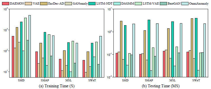 在论文中,作者针对多维时序异常检测问题提出了基于变分自编码器以及GAN的DAEMON算法,经过测试,DAEMON算法可以在公开数据集上达到SOTA的性能,并且也能达到SOTA的根因定位能力。其次,DAEMON的训练,检测时间效率也能在现有算法中达到中上水平。