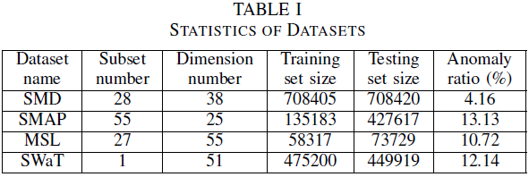 在仿真中,作者对比了四个常用且公开的时序异常检测数据集,即SMD, SMAP, MSL, SWaT数据集。下面是各个数据集的具体指标。