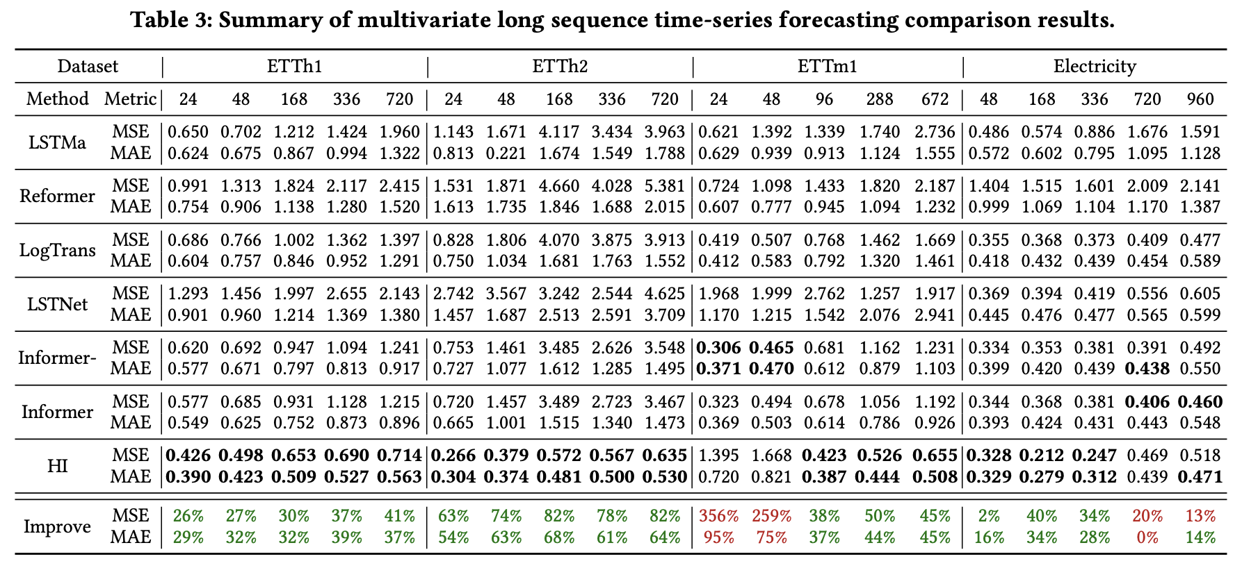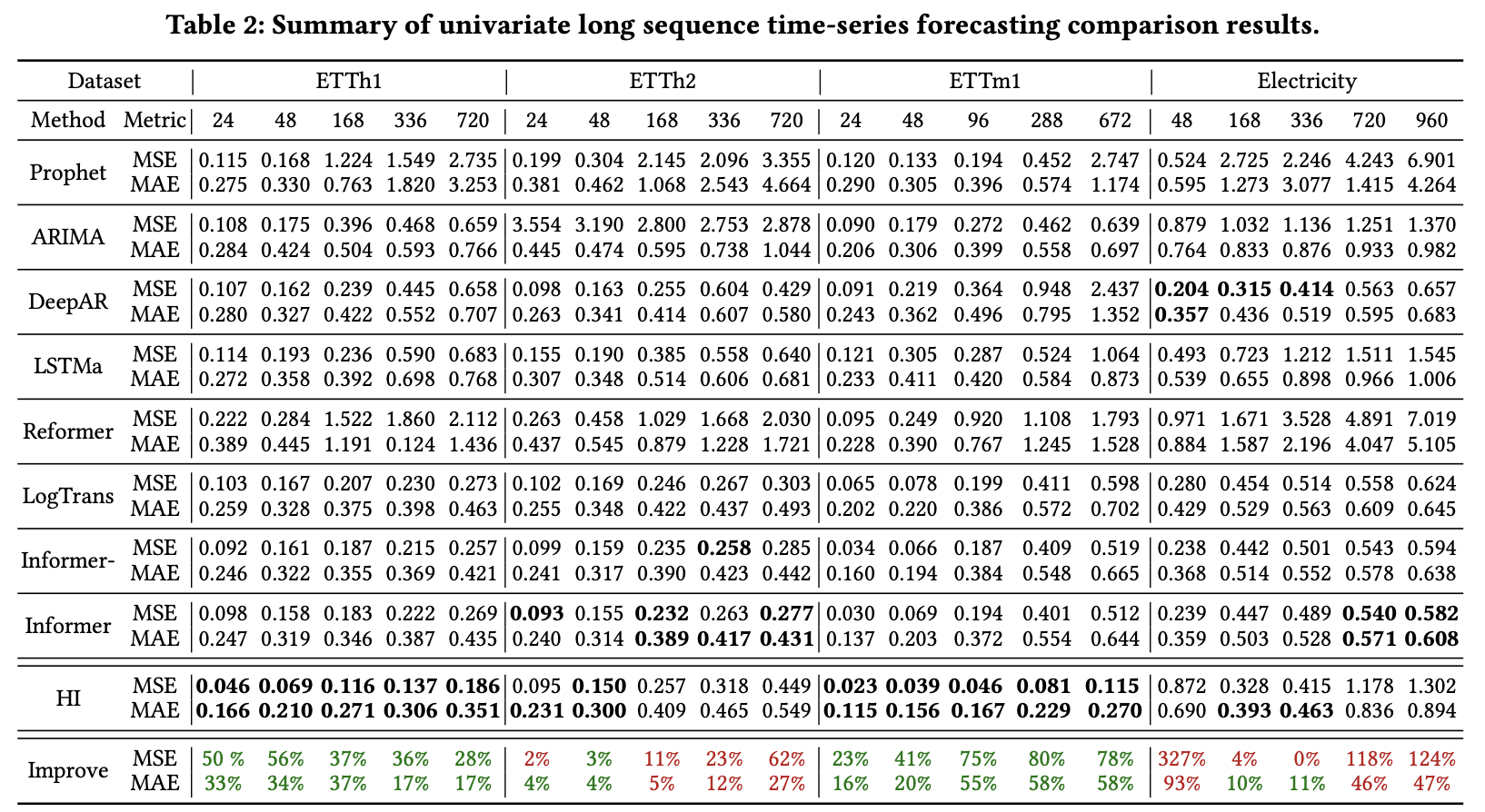 对于单变量长时间序列预测任务,HI在ETTh1和ETTm1数据集上显著优于SOTA模型。Informer及其变体主导了ETTh2数据集的最优结果。而对于Electricity数据集,HI,Informer和DeepAR都有较好的表现。整体来看,HI在MSE和MAE上分别实现了高达80%和58%的相对提高。