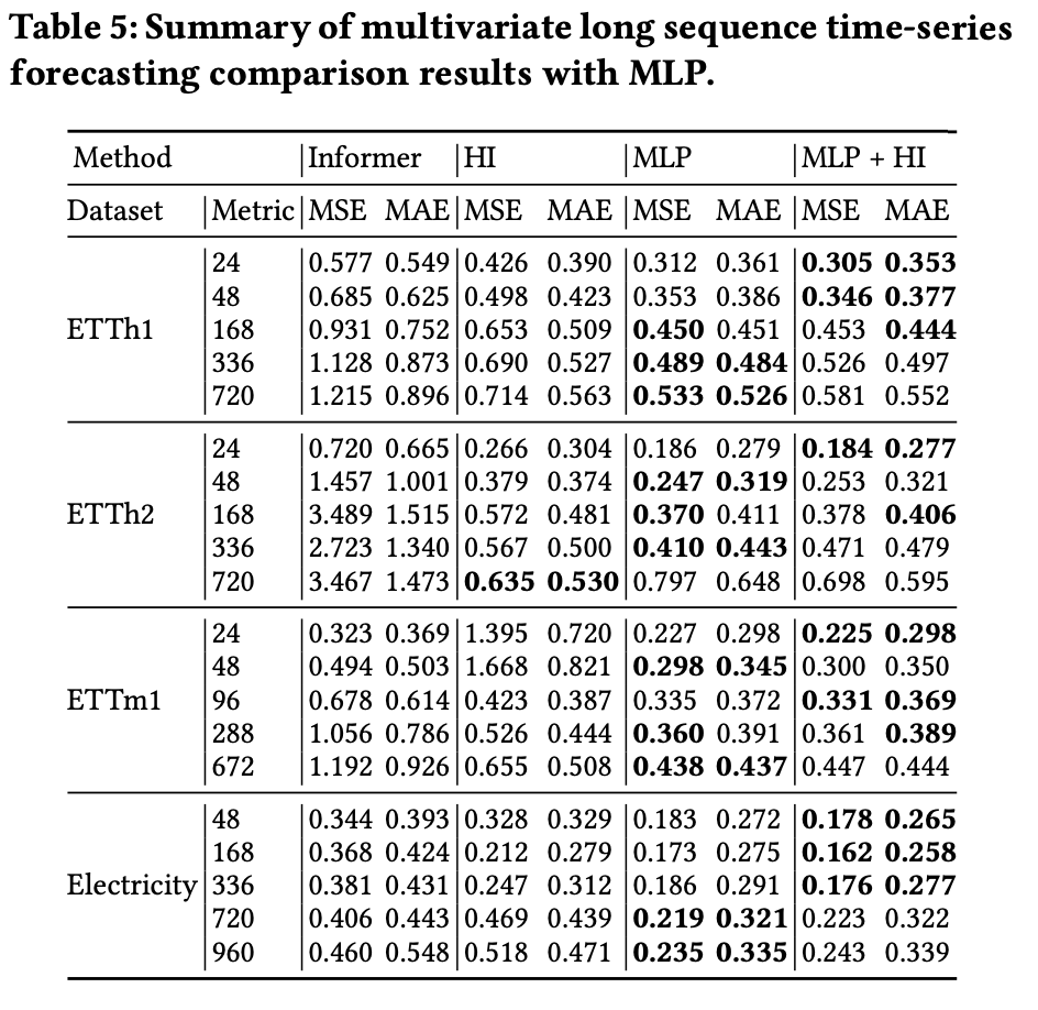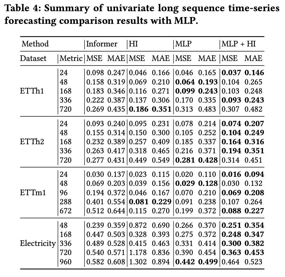 对于融合模型这一方向,我们设计了简单的实验予以验证:将HI与2层MLP模型的输出结果取平均得到最终预测结果。实验结果表明,融合HI的MLP模型可实现更准确的预测,并且此优势在单变量长时间序列预测任务上更显著。