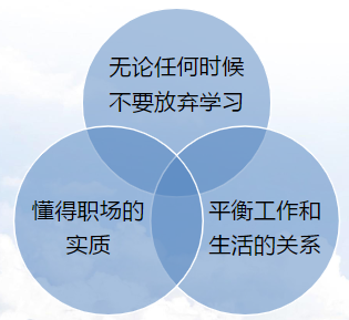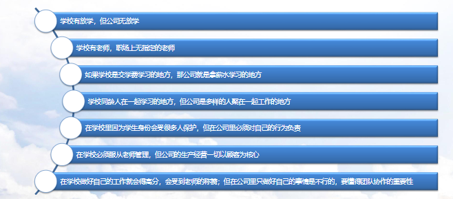 首先要正确的认识社会人的新角色。学生角色与职业人的角色有着很大的区别。职业人所经历的环境更加负责,强调独立思考,容错率更低。